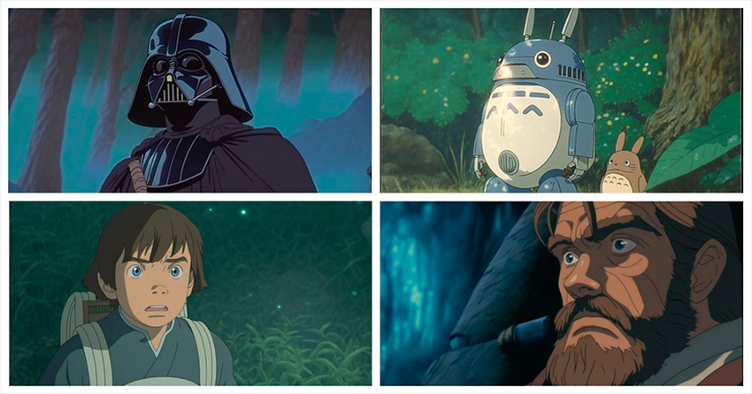 Das neuronale Netzwerk hat die Hauptcharaktere der fernen Galaxie modifiziert - Luke Skywalker, Obi-Wan Kenobi, R2D2, der Totoro aus dem Anime My Neighbor Totoro ähnelt und Darth Vader, der hier wie der epischste Bösewicht im Anime aussieht.
