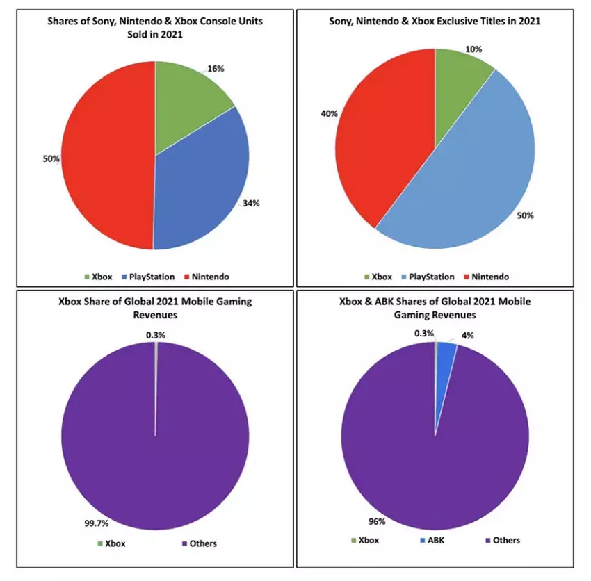 Nebenbei hat Microsoft der FTC bewiesen, dass es auf dem Markt für Konsolenspiele nicht führend ist, und im Bereich der mobilen Spiele wird sich die Position des Unternehmens nach der Übernahme von Activision Blizzard nicht wesentlich verbessern. All dies wird in den Diagrammen dargestellt: