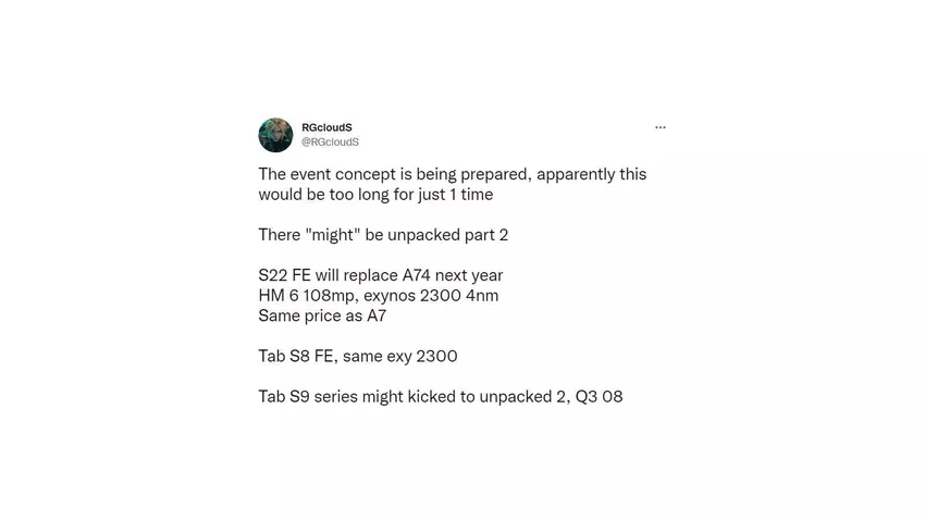 So deutet RGcloudS an, dass das Galaxy S22 FE in etwa das Gleiche kosten wird wie das A73, das nur in wenigen Ländern zu einem Preis von etwa 500 Dollar auf den Markt gekommen ist. Das Galaxy S21 FE kostet dagegen 700 Dollar.