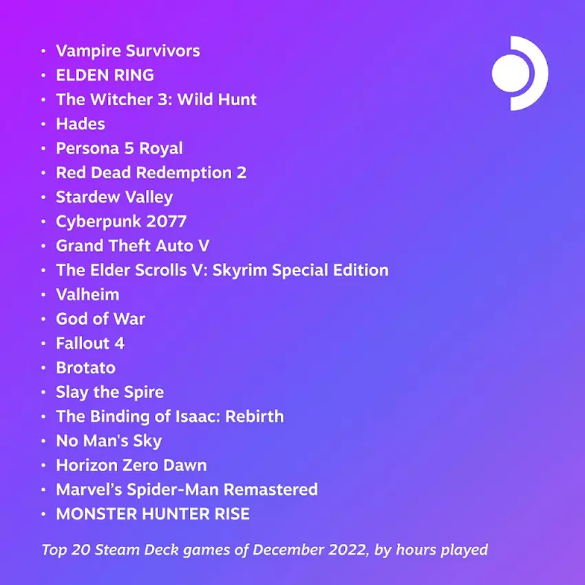 Der offizielle Twitter-Account Steam Deck veröffentlichte eine Liste der beliebtesten Spiele des Handhelds im Dezember.