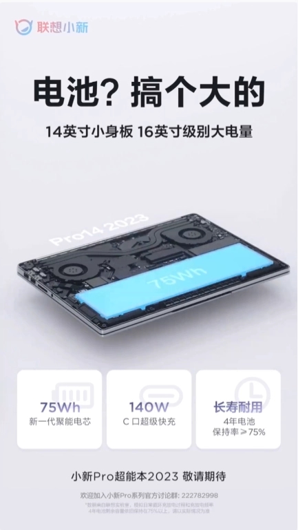 Das neue Produkt wird unter dem Namen Xiaoxin Pro 2023 auf den Markt kommen. Laut dem offiziellen Plakat wird das Gerät mit einem 75-Wh-Akku ausgestattet sein. Der Akku wird die Schnellladetechnik mit einer Kapazität von 140 W unterstützen. Von 0 auf 66% kann der Laptop in 30 Minuten aufgeladen werden. Nach Angaben des Unternehmens hält der Akku bis zu 4 Jahre mit mehr als 1.000 Ladezyklen.