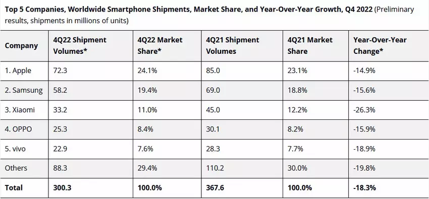 So sind die weltweiten Smartphone-Lieferungen am Ende des vierten Quartals um 18,3 % zurückgegangen, der stärkste Rückgang in einem einzigen Quartal. Insgesamt wurden in dieser Zeit 300,3 Millionen Geräte ausgeliefert.