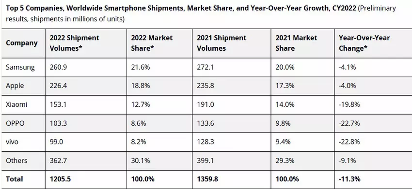 Betrachtet man die Gesamtzahl für 2022, so sanken die weltweiten Smartphone-Lieferungen um 11,3 % auf 1,21 Milliarden.