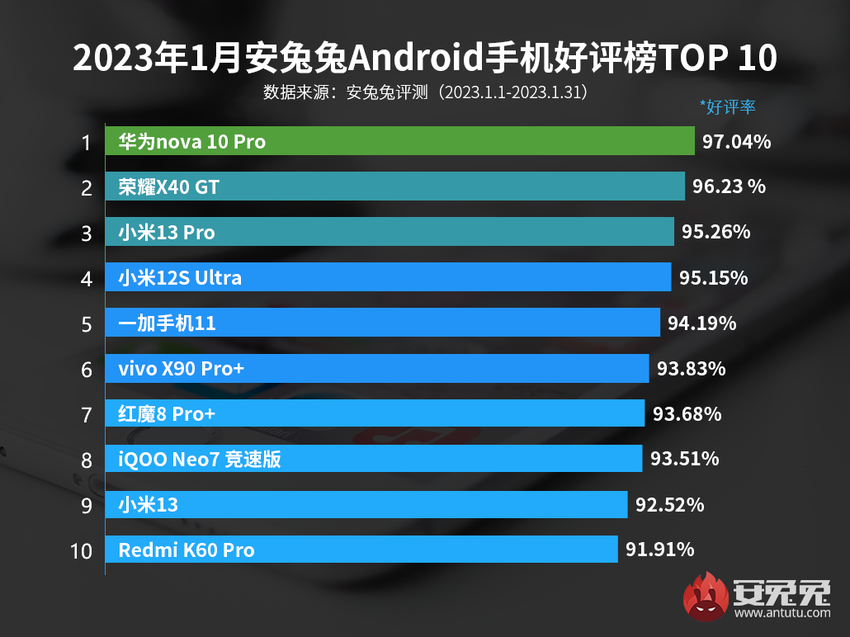 Der erste Platz ging an das Huawei nova 10 Pro und der zweite an das Honor X40 GT. Das Flaggschiff-Smartphone Xiaomi 13 Pro, das sich gegen das Xiaomi 12S Ultra durchsetzte, rundet die Top 3 ab. Das Debütmodell des Unternehmens mit einer Leica-Kamera landete auf Platz 4, das aktuelle OnePlus 11 auf Platz 5. Übrigens war das OnePlus 11 laut AnTuTu das leistungsstärkste Smartphone des Jahres 2023.