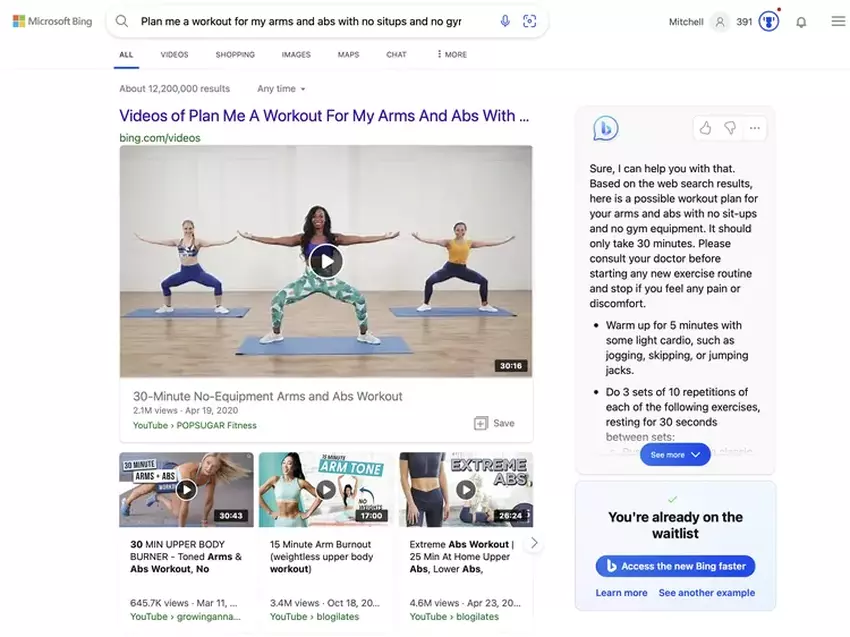 Wenn Sie jetzt auf Bing.com gehen, sehen Sie Beispiele für KI-gestützte Suchanfragen, die Sie sofort ausprobieren können (vorausgesetzt, Ihnen wird das neue Design angezeigt). Wenn Sie auf eine dieser Empfehlungen klicken, gelangen Sie auf eine Standardsuchseite mit herkömmlichen Ergebnissen auf der linken Seite, aber mit einem Chat-Feld auf der rechten Seite, in dem eine von der künstlichen Intelligenz generierte Antwort angezeigt wird. Solange Sie keinen Zugang haben, können Sie keine weiteren Fragen stellen oder die Ergebnisse präzisieren. Wenn Sie versuchen, mit Ihrer eigenen Suchanfrage nach etwas zu suchen, erhalten Sie die üblichen Bing-Ergebnisse, auch wenn diese in einem neuen Stil angezeigt werden.