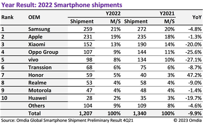 Insgesamt lieferten die Hersteller in 12 Monaten 1,207 Milliarden Smartphones aus. Im Vergleich zu 2021 sank der Absatz um 9,9 % bzw. 133 Millionen Stück, gemessen am Volumen.