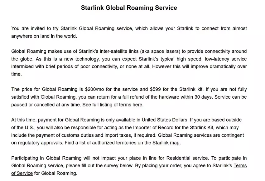 Der Tarif nennt sich Global Roaming Service. Starlink behauptet, dass man damit "von praktisch überall auf der Welt eine Verbindung herstellen" kann.