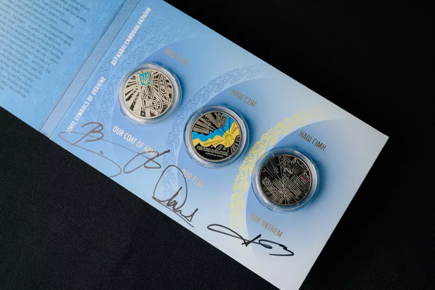 • 4 Sätze von Münzen "Staatssymbole der Ukraine": "Unser Wappen", "Unsere Flagge", "Unsere Hymne" mit den Unterschriften von Präsident Volodymyr Zelensky, Premierminister Denis Shmygal und dem Vorsitzenden der Werchowna Rada Ruslan Stefanchuk.