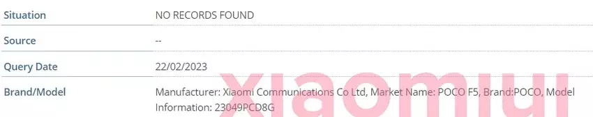 Das POCO F5 ist in der IMEI-Datenbank aufgetaucht. Auf der Website der Regulierungsbehörde heißt es, dass das Smartphone die Modellnummer 23049PCD8G hat. Außerdem wurde das Gerät erst vor wenigen Tagen, am 22. Februar, in der Datenbank registriert.