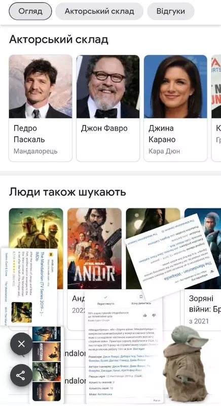 Wenn du "The Mandalorian", "Mandalorian", "baby Yoda" oder "Grogu" in verschiedenen Sprachen in die Suche eingibst, erscheint in der unteren rechten Ecke ein Bild von Baby Yoda. Klicken Sie darauf und Grogu fängt an, Blöcke von Suchergebnissen gewaltsam zusammenzuklappen.
