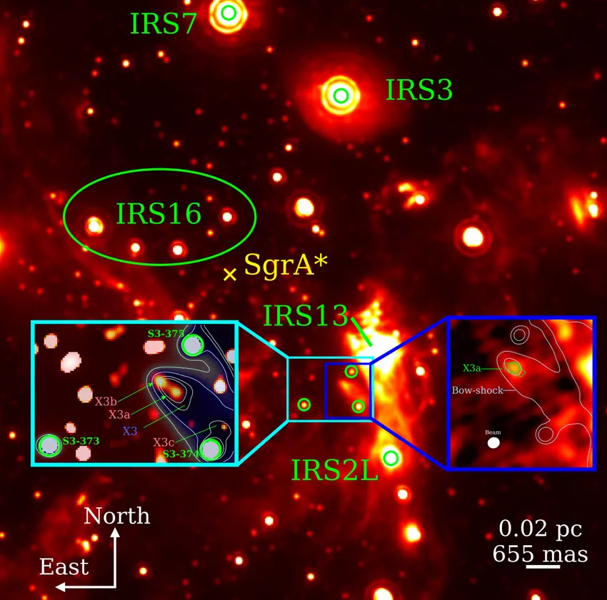 X3a ist eine Größenordnung größer als die Sonne und hat eine Masse, die 15 Mal so groß ist wie die unserer Sonne. Wissenschaftler gehen davon aus, dass er einige Lichtjahre vom Schwarzen Loch Sagittarius A* entfernt zu entstehen begann. Es ist nicht ausgeschlossen, dass das gleiche Prinzip der jungen Sterne auch in anderen Galaxien funktioniert. Das James-Webb-Weltraumteleskop wird in der Lage sein, diese Hypothese zu testen.