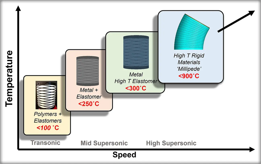 Das AFRL arbeitet an einer "Verbundstruktur, die aus einem mit Elastomer gefüllten Metallinnenrahmen besteht". Die US-Luftwaffe strebt ein Design an, das für den Einsatz jenseits der Überschallgeschwindigkeit geeignet ist, wo die Komponenten Temperaturen von bis zu 900 Grad Celsius ausgesetzt sind.