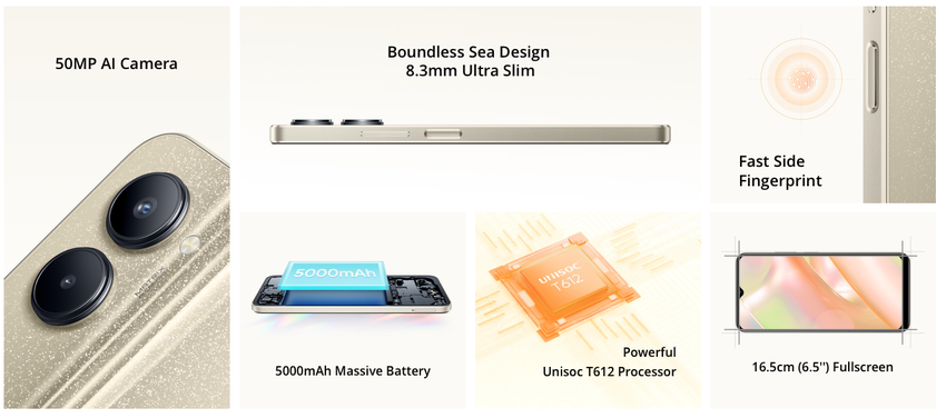Die anderen Spezifikationen des Smartphones sind die gleichen: ein 6,52-Zoll-LCD-Display mit HD+-Auflösung, Unisoc T612-Prozessor, 5000mAh-Akku, 10W-Ladefunktion, seitlich angebrachter Fingerabdruckscanner, 50MP + 5MP Hauptkamera und 5MP Frontkamera.