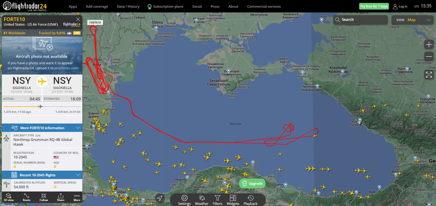 Während das US-Verteidigungsministerium erwägt , auf den Einsatz von Drohnen im Schwarzen Meer ganz zu verzichten, ist eine Drohne erneut geflogen und hat sich der russischen Grenze genähert. Es war die RQ-4B Global Hawk von Northrop Grumman.