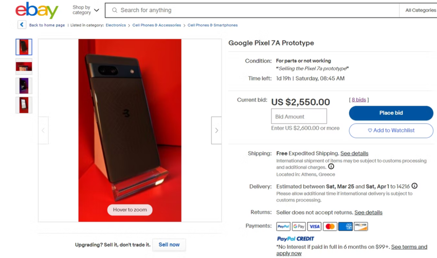 Das Pixel 7a wurde bei eBay mit einem Startpreis von 1650 US-Dollar versteigert. Im Laufe der Zeit stieg der Preis des Smartphones um etwa das Eineinhalbfache auf 2550 US-Dollar. Inzwischen wurde der Prototyp jedoch aus der Auktion zurückgezogen.
