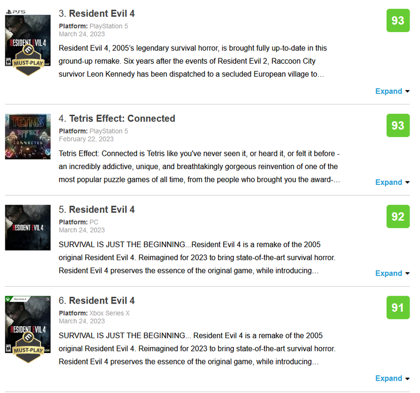 Die Plätze drei, fünf und sechs werden von einem Spiel belegt - Resident Evil 4 Remake. Die höchste Punktzahl ist 93 für die PlayStation 5-Version. Die PC- und Xbox Series X-Versionen erhielten 92 bzw. 91 Punkte.