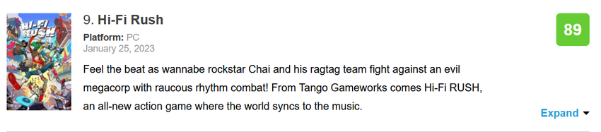 Das einzige Spiel auf der Liste, das kein Remaster oder Remake ist, ist Hi-Fi Rush. Es erhielt 89 Punkte von der Presse und 8,8 Punkte von den Spielern.