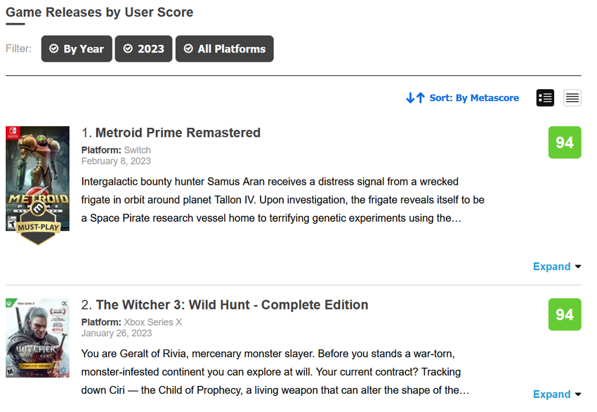 Metroid Prime Remastered und The Witcher 3: Wild Hunt - Complete Edition haben die höchsten Wertungen auf Metacritic. Sie haben 94 Punkte von der Presse und 8,8 bzw. 8,4 Punkte von den Spielern.