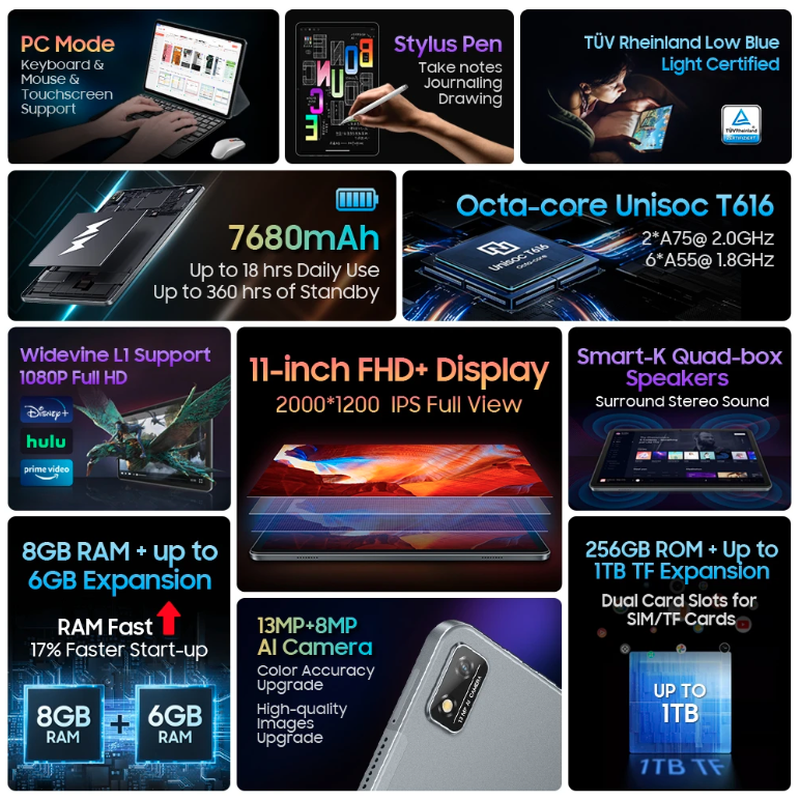 Das Blackview Tab 16 wird von einem 7680-mAh-Akku angetrieben. Er unterstützt das Aufladen mit 18 W. Nach Angaben des Herstellers ermöglicht eine 30-minütige Aufladung eine Betriebsdauer von bis zu 4 Stunden. Das Gerät verfügt über einen Octa-Core-Prozessor Unisoc T616, 8 GB RAM (+ 6 GB virtueller RAM) und 256 GB Speicher. Der integrierte Speicher kann mit einer Speicherkarte um bis zu 1 TB erweitert werden. Das Gerät verfügt außerdem über vier Smart-K-Lautsprecher. Es gibt zwei Kameras in der Neuheit: die Hauptkamera hat 13 MP und die Frontkamera 8 MP.
