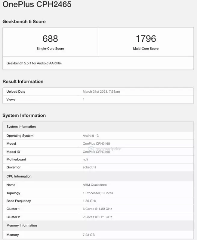 Die Rede ist von dem OnePlus Nord CE 3 Lite. Die Neuheit kommt mit der Modellnummer CPH2465. Der Leak bestätigt, dass das Gerät von einem Octa-Core Snapdragon 695 Prozessor angetrieben wird. Abgesehen davon wird das Gerät mit 8 GB RAM und dem Betriebssystem Android 13 ausgeliefert.
