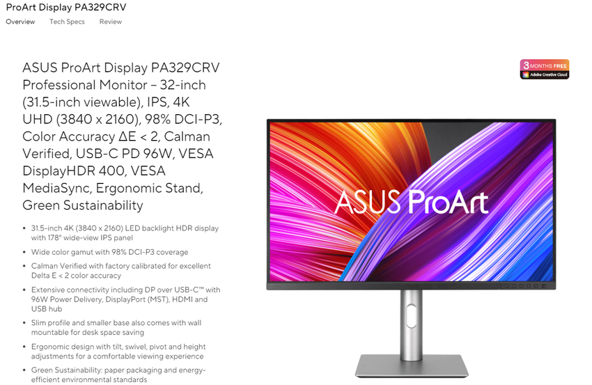 Das ASUS ProArt Display PA329CRV verfügt über ein 4K ULTRA HD IPS-Panel mit einer Auflösung von 3840 x 2160 Pixeln. Da sich das Modell nicht an Gamer richtet, erhält es keine Unterstützung für höhere Bildwiederholraten. Nur 60 Hz.