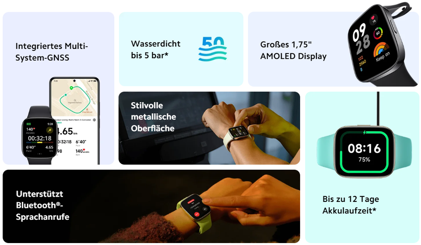 Die Redmi Watch 3 bekommt ein 1,75 Zoll großes, rechteckiges Display. Der Bildschirm basiert auf einer AMOLED-Matrix mit einer Dichte von 341 Punkten pro Zoll, einer Helligkeit von bis zu 600 nits und Always-on Display. Die Auflösung beträgt 390 x 450 Pixel.