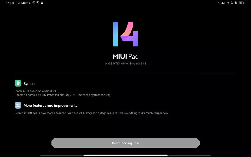 Was die Liste der Änderungen anbelangt, so erhielt das Tablet den Google-Sicherheitspatch vom Februar. Darüber hinaus haben die Entwickler Fehler behoben und alle wichtigen Funktionen von MIUI 14 in das System integriert.