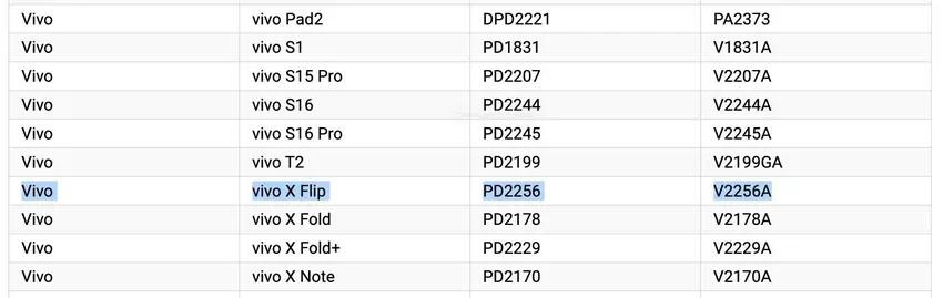 Das Leck bestätigt den Namen des Smartphones. Darüber hinaus besagt die Datenbank, dass das vivo X Flip die Modellnummer V2256A trägt.