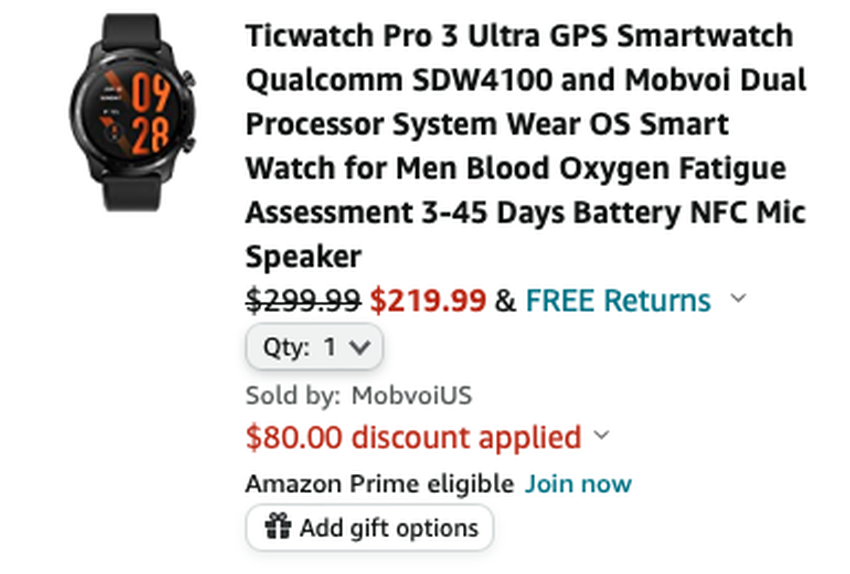 Es handelt sich um das Modell TicWatch Pro 3 Ultra GPS. Das Gadget kostet derzeit check price on amazon. Aber mit einem Coupon des Verkäufers ist die Uhr für $80 zu haben.