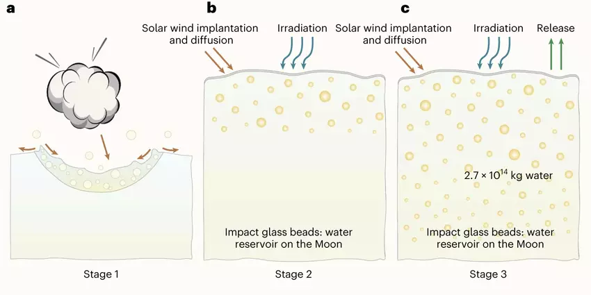 Es könnte nicht nur für die menschliche Besiedlung eines natürlichen Satelliten, sondern auch für die Herstellung von Raketentreibstoff verwendet werden. Moderne wissenschaftliche Theorien besagen, dass das Wasser auf dem Mond durch Sonnenwinde gebildet wird, wenn sich Wasserstoffionen mit Sauerstoff im Regolith verbinden. Obwohl ein Teil des Wassers verdunstet, kann das Einschlagglas es aufnehmen und speichern.