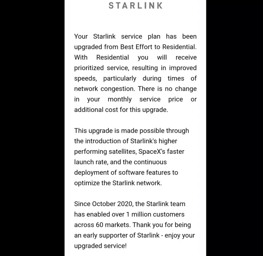 SpaceX hat Benachrichtigungen an Kunden verschickt, die sich für den Best Effort-Tarif angemeldet haben. Zuvor erhielten sie einen Second-Line-Zugang zu Starlink und hatten Beschränkungen bei den Verbindungsgeschwindigkeiten, obwohl sie zum gleichen Tarif wie die regulären Abonnenten zahlten.