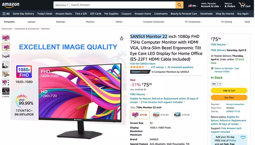 Amazon verkauft einen Sansui 22in, 1080p, 75Hz Monitor für $75.98