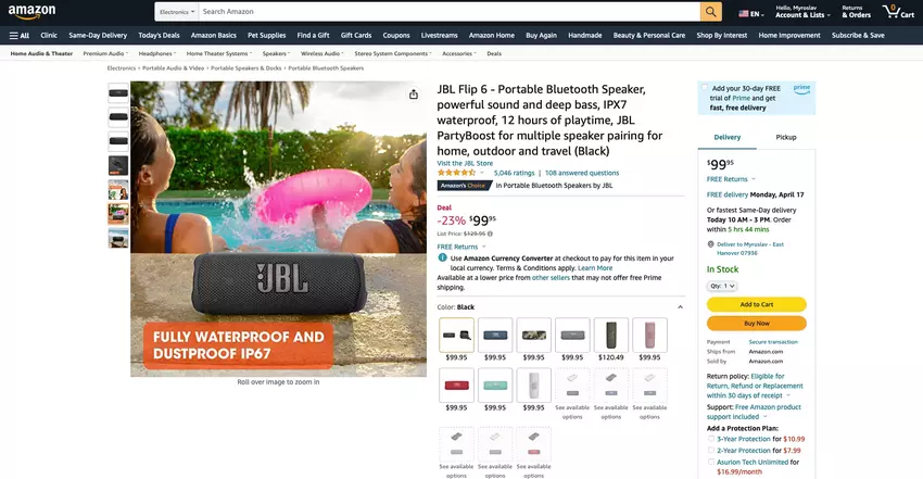Die Rede ist vom JBL Flip 6. Der Lautsprecher wurde im Jahr 2021 eingeführt, ist aber immer noch aktuell. Das Gerät wird derzeit für $129.95- $129.95 angeboten $129.95.