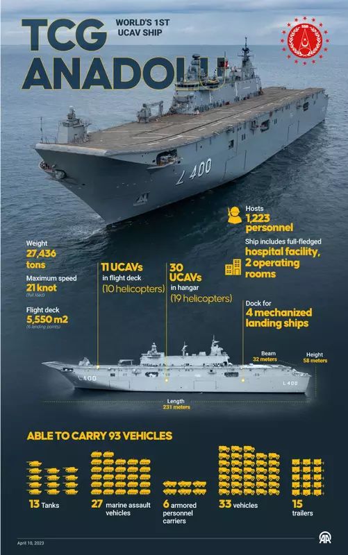 Die TCG Anadolu ist 231 Meter lang, 32 Meter breit und 58 Meter hoch. Das Schiff kann 10 Hubschrauber oder 11 Drohnen an Deck und 19 Hubschrauber oder 30 Drohnen im Hangar unterbringen. Darüber hinaus kann die TCG Anadolu 12 F-35B Lightning II-Kurzstart- und Senkrechtlandeflugzeuge der fünften Generation aufnehmen.