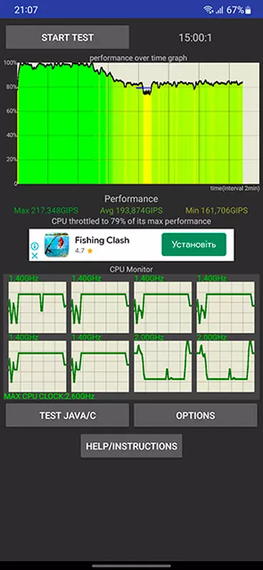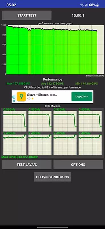 Samsung Galaxy A54 arbeitet auch bei längerer Belastung stabil. Der CPU Throttling Test zeigte, dass der Leistungsabfall bis zu 89% betragen kann, was ein ganz normaler Indikator ist. Der Körper wird warm.
