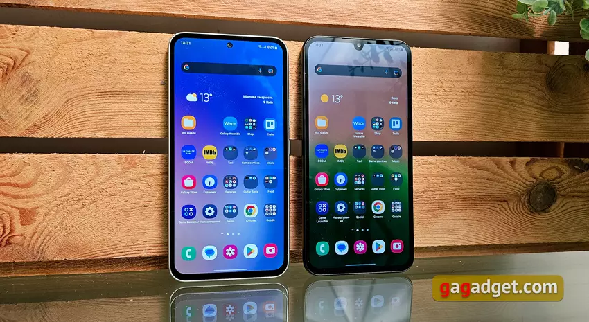 Samsung Galaxy A54 und Galaxy A34 sind mit Super AMOLED-Bildschirmen mit einer FullHD+-Auflösung von 2340x1080, einem Seitenverhältnis von 19,5:9, einer Spitzenhelligkeit von 1000 nits, HDR10+-Unterstützung und einer Bildwiederholfrequenz von 120 Hz ausgestattet. Der einzige Unterschied liegt in der Bildschirmdiagonale und dementsprechend in der Pixeldichte. Das Samsung Galaxy A54 hat eine Diagonale von 6,4 Zoll und eine Pixeldichte von 403 ppi, während das Galaxy A34 eine Diagonale von 6,6 Zoll und eine Pixeldichte von 390 ppi hat. Die Bildschirme sind von guter Qualität, mit ausreichender Helligkeit und maximalen Blickwinkeln. Aber bei den ersten Blickwinkeln bekommt die weiße Farbe einen Grünstich, was für viele AMOLED-Bildschirme typisch ist. Ein Live-Vergleich mit den Flaggschiffen zeigt also, dass die Bildschirme der A-Serie etwas bescheidener sind, aber optisch gibt es keine nennenswerten Beanstandungen.