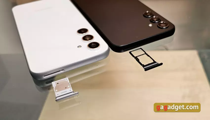 Die Ablage ist in diesem Fall hybrid. Das heißt, es ist möglich, entweder zwei SIM-Karten einzusetzen oder den Speicher mit einer MicroSD-Karte anstelle der zweiten Karte zu erweitern. Das ältere Modell Galaxy A54 hat auch eSIM-Unterstützung.