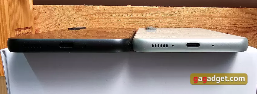 Der allgemeine minimalistische Stil von Smartphones hat nicht nur die diesjährigen Flaggschiffe, sondern auch günstigere Modelle erfasst. Am auffälligsten ist er jedoch auf der Rückseite. Wir werden später darauf zurückkommen. Das Samsung Galaxy A54 und das Galaxy A34 haben flache Bildschirme, die durch Gorilla Glass der fünften Generation geschützt sind. Von der Vorderseite ist alles bekannt: ein Bildschirm, eine Frontkamera und ein dünner Schlitz für den Hörerlautsprecher. Die Ränder um die Bildschirme sind natürlich nicht so dünn wie bei den Flaggschiffen. Das Samsung Galaxy A54 hat eine Frontkamera in einem kleinen runden Loch. Beim Galaxy A34 ist sie auf eine eher altmodische Weise angebracht: eine tropfenförmige Aussparung. Die Einfassungen der Smartphones sind aus Kunststoff und haben ein mattes, angenehmes Finish. Die Bedienelemente und andere Funktionselemente sind völlig identisch und in gewohnter Weise angeordnet. Die Einschalt- und Lautstärketasten befinden sich auf einer angenehmen Höhe, so dass man nicht danach greifen muss.