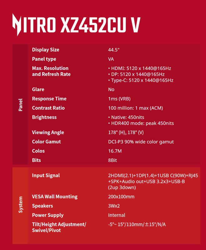 Der Monitor basiert auf einem VA-Panel mit einem Krümmungsradius von 1500R. Die 8-Bit-Matrix hat eine Auflösung von 5120 x 1440 Pixeln, eine Diagonale von 44 Zoll, eine Bildwiederholfrequenz von 165 Hz, eine Reaktionszeit von 1 ms, eine Helligkeit von 450 nits und unterstützt DisplayHDR400. Die Abdeckung des DCI-P3-Farbbereichs beträgt 90 %.