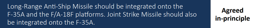 Auf Seite 61 des DSR heißt es, dass Australien seine F-35A Lightning II-Kampfflugzeuge der fünften Generation auf Block 4 aufrüsten sollte. Dadurch würden sie mit Mehrzweck-Marschflugkörpern vom Typ Joint Strike Missile (JSM) ausgerüstet.