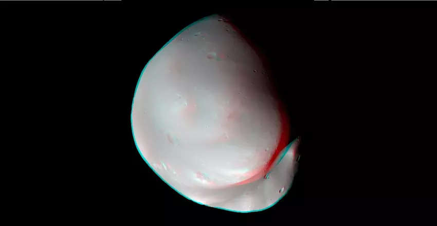Deimos ist an den Mars gezeitengebunden wie der Mond an die Erde. Das bedeutet, dass bei der Beobachtung des Satelliten aus einer niedrigen Umlaufbahn oder von der Oberfläche des Roten Planeten aus nur eine Seite des Satelliten zu sehen ist. Aufgrund seiner verlängerten Umlaufbahn - 40.000 km an seinem höchsten Punkt - kann Hope jedoch Fotos von der Rückseite von Deimos machen.