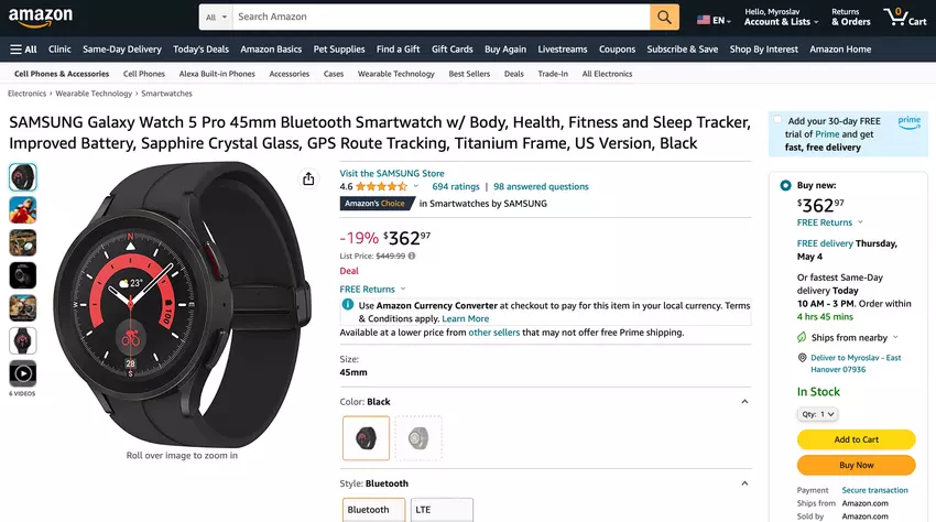 Samsung Galaxy Watch 5 Pro Smartwatch wird auf Amazon mit einem Rabatt von $87 angeboten