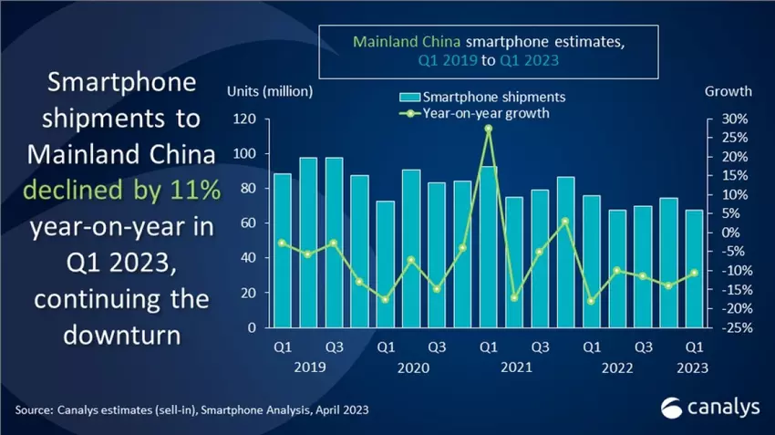 Der chinesische Smartphone-Markt ist im ersten Quartal 2023, wie auch der Weltmarkt, im Vergleich zum Vorjahreszeitraum zurückgegangen. Alle fünf führenden Unternehmen lieferten weniger Geräte aus als vor einem Jahr. Insgesamt sank der Markt um 11 %, von 75,6 Millionen auf 67,6 Millionen Smartphones.