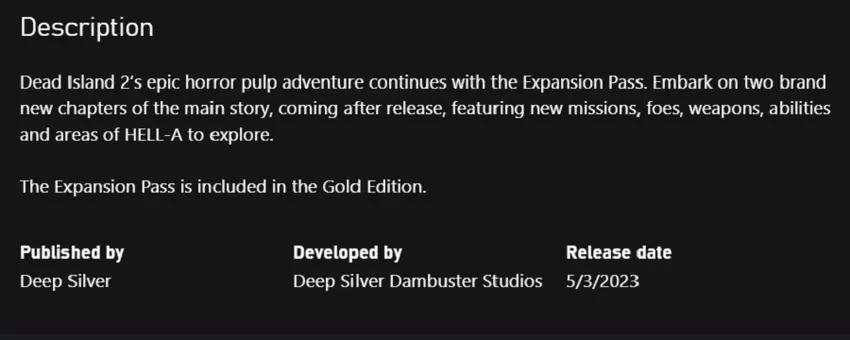 In der Beschreibung heißt es, dass der Pass zwei Story-Erweiterungen mit neuen Schauplätzen, Waffen, Quests und "einer Extraportion schrecklichem Spaß" enthalten wird.