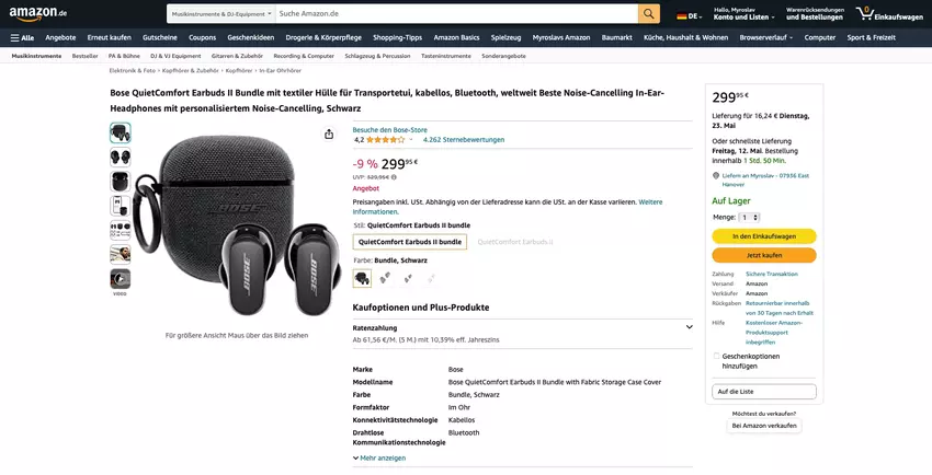 Bose QuietComfort Earbuds II auf Amazon: TWS-Flaggschiff-Kopfhörer mit ANC und Schutzhülle für 30 Euro reduziert