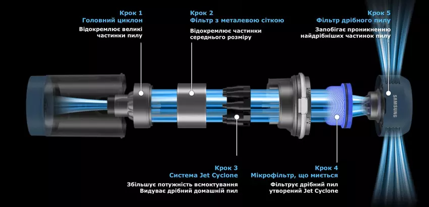 Eine wichtige Filterstufe ist das Jet-Cyclone-System, das mithilfe von 9 Zyklonen Wirbel aus der Luft erzeugt und diese in 27 Reihen angeordnete Löcher leitet. Nach Angaben des Herstellers trägt dies zu einer effizienteren Reinigung bei, da diese besondere Konstruktion die Saugkraft erhöht und eine bessere Reinigung gewährleistet.
