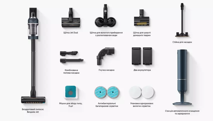 Es ist nicht übertrieben zu sagen, dass die Ausstattung des Samsung Bespoke Jet beeindruckend ist (zumindest habe ich keine Nassreinigungsbürste und keinen zusätzlichen Akku erwartet). Hier ist die vollständige Liste: