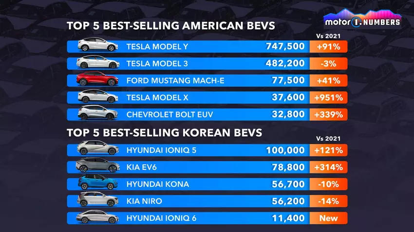 Unter den Top 10 findet sich kein einziges südkoreanisches Elektroauto. Am beliebtesten war der Hyundai Ioniq 5 mit 100.000 Einheiten (+121%). Bei den europäischen Autos schaffte es nur der Volkswagen ID.4 in die Top Ten. Sein Absatz erreichte 175.600 Einheiten (+53%), was ihm den sechsten Platz einbrachte.