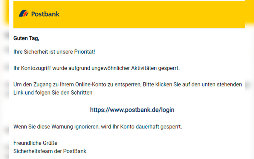Auch Kunden der Postbank sind derzeit Ziel von Kriminellen. Unter dem Vorwand "ungewöhnlicher Aktivitäten" versuchen die Betrüger, an sensible Daten der Kunden zu gelangen. In einer aktuellen E-Mail wird behauptet, dass das Konto des Kunden gesperrt wurde und zur Entsperrung wird aufgefordert, einem beigefügten Link zu folgen. Wie üblich wird mit einer dauerhaften Kontosperrung gedroht, wenn die Anweisungen nicht befolgt werden. Die E-Mail ist unpersönlich formuliert, enthält Rechtschreibfehler und bedrohliche Elemente, typisch für einen Betrugsversuch.
