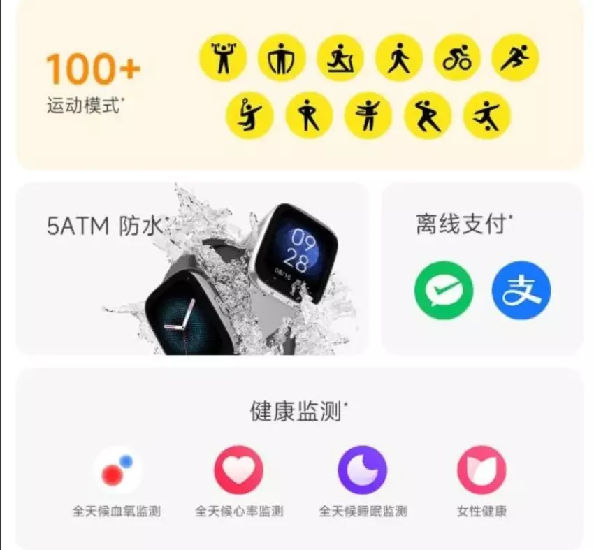 Die Uhr kann rund um die Uhr die Herzfrequenz und den Sauerstoffgehalt im Blut überwachen, unterstützt über 100 Sportmodi und hilft bei der Überwachung der Gesundheit von Frauen. Über Bluetooth können Nutzer eingehende Anrufe empfangen.